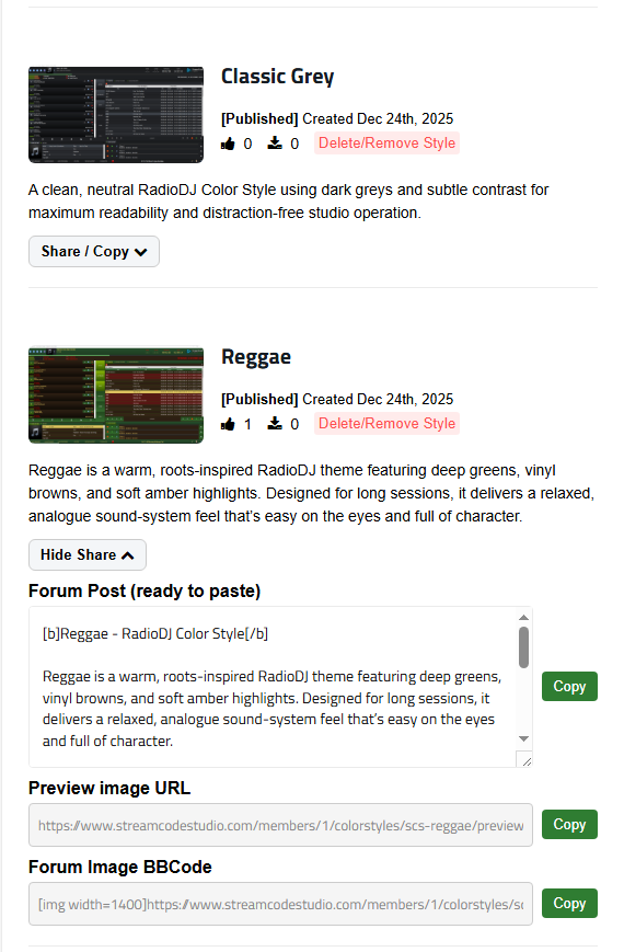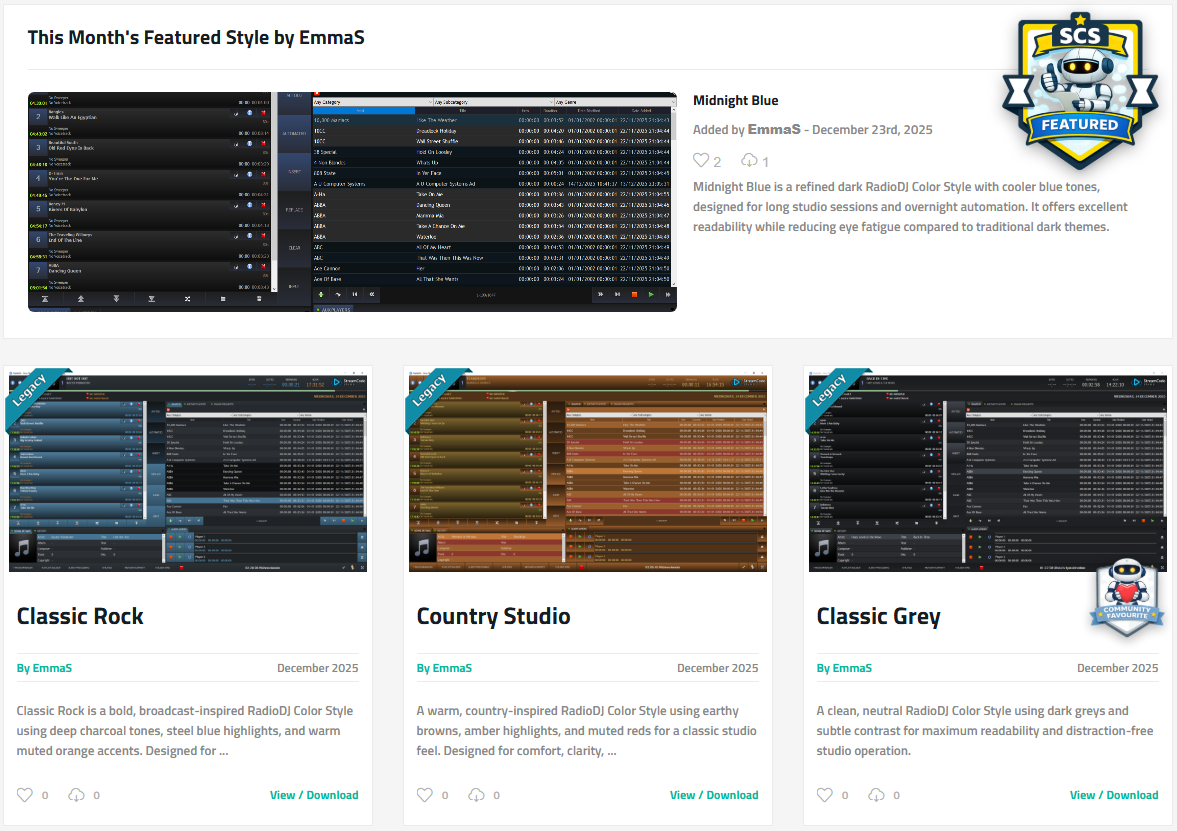 I've added a new RadioDJ Color Styles section to StreamCode Studio, where users can browse and download free UI themes for RadioDJ.